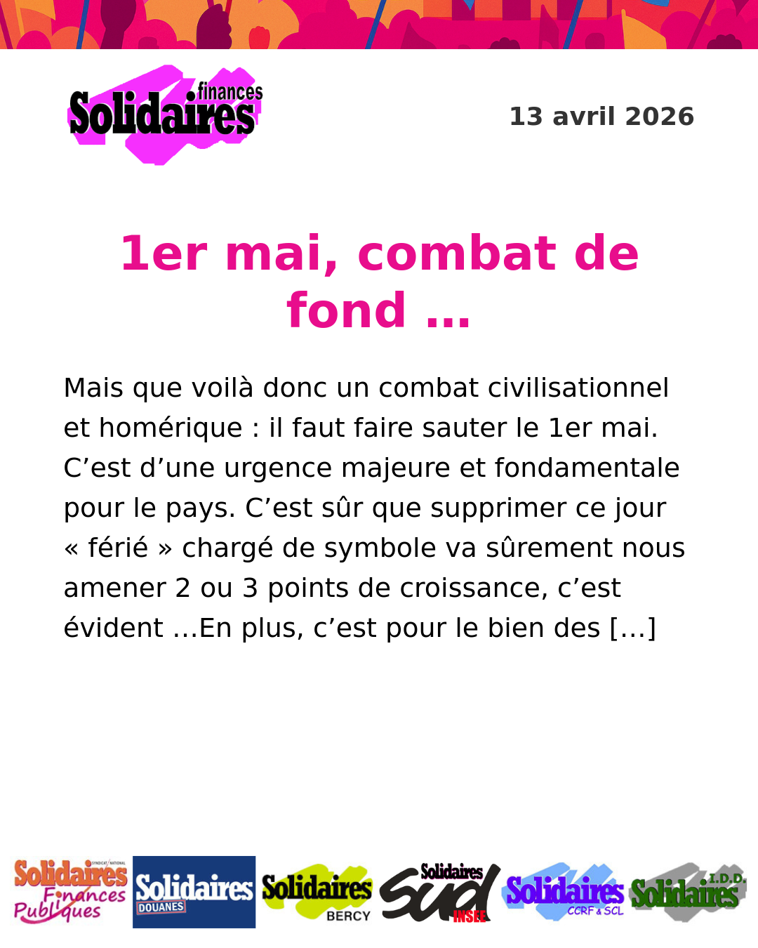Mais que voilà donc un combat civilisationnel et homérique : il faut faire sauter le 1er mai. C’est d’une urgence majeure et fondamentale pour le pays. C’est sûr…