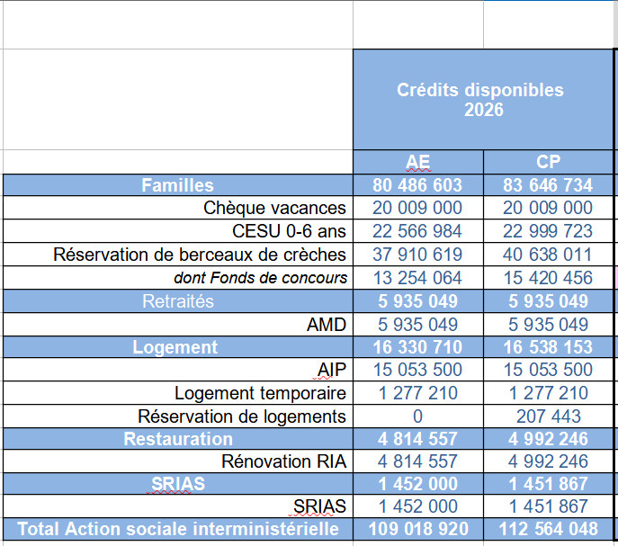 Après avoir traversé une nouvelle période de services votés, la loi de finances initiale pour 2026 a été adoptée. Il apparaît clairement que l’action sociale interministérielle est une fois encore fortement impactée par des mesures budgétaires restrictives. Après une diminution historique de 27 millions d’euros en 2025, une nouvelle réduction de 19,5 millions d’euros est désormais exigée. Cette baisse, significative, pèse lourdement sur les prestations existantes.